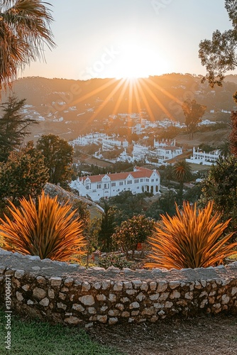 Sunset over charming white buildings nestled among trees on hillside, viewed over stone wall