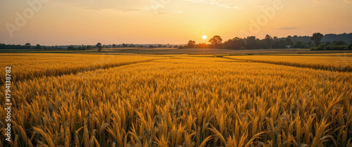 Sunset over golden rice fields agricultural landscape nature photography rural serenity wide view tranquil environment