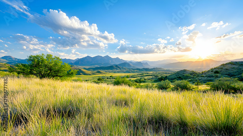 Sunset over grassy plains and distant mountains; scenic landscape for travel brochures