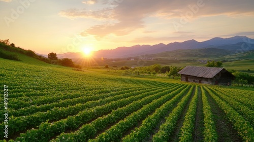 Sunset over green agricultural field