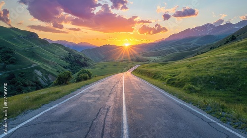 Sunset over green mountain landscape with square asphalt road