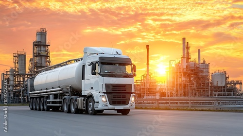 Sunset over industrial landscape with a freight truck transporting goods through a vibrant skyline