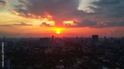 Sunset over Lumpini area from a rooftop bar in Bangkok, showcasing the vibrant cityscape and sky colors.