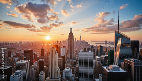 Sunset over modern city skyline, digital business inspiration