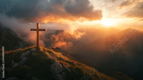 Sunset over mountain with cross: dramatic sky and tranquil landscape.