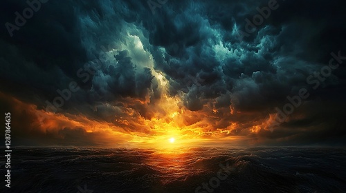 Sunset over ocean with dark clouds and light breaking through in moody atmosphere