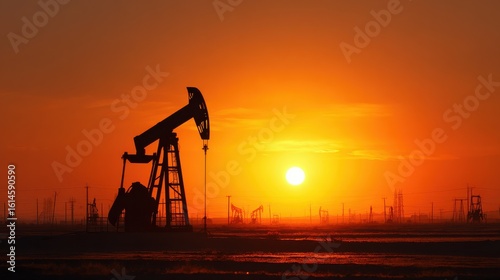 Sunset Over Oil Pump Jack Silhouettes in an Industrial Landscape with Warm Orange Horizon and Clear Sky