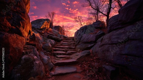 Sunset over rocky steps leading to the horizon, vibrant sky.