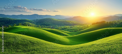 Sunset over rolling green hills and mountains. Peaceful landscape ideal for travel brochures