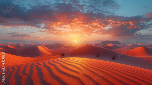Sunset over the desert of Al Khatim in Abu Dhabi, Emirates. Golden Sand Dune Desert Landscape Panorama
