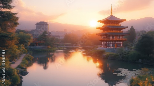 Sunset Over Traditional Architecture and Serene Water Reflections