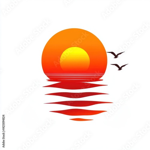Sunset over water, birds flying, simple graphic, peaceful scene, suitable for posters or backgrounds