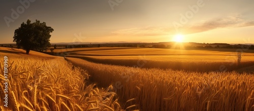 Sunset over wheat field. Panoramic view of agricultural landscape
