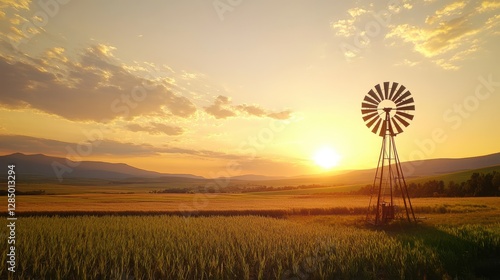 Sunset over Windmill in Serene Countryside Landscape with Field