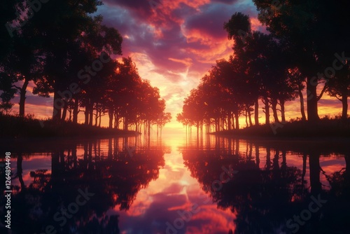 Sunset reflecting on a lake surrounded by trees in a tranquil, scenic view