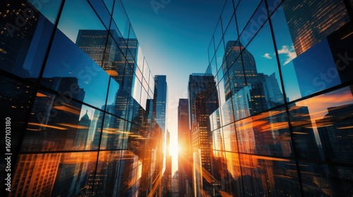 Sunset reflection on skyscrapers urban cityscape architectural photography modern environment low angle view urban development concept