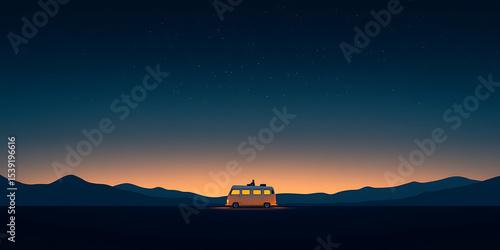 Sunset road trip. Stars fill the night sky as a lone traveler atop a van observes the landscape. Adventure and peaceful journey concept.
