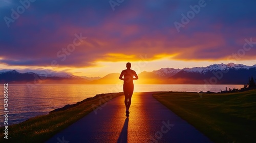 Sunset Run by the Sea - Silhouette of a runner enjoying a scenic coastal path at sunrise, symbolizing freedom, health, perseverance, peace, and achievement.