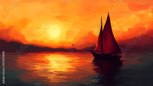 Sunset Sailboat Painting Orange Sky Calm Sea