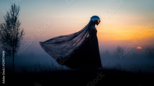 Sunset Silhouette Ethereal Woman in Flowing Gown Helmet