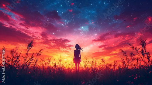 Sunset Silhouette Digital Painting: Girl in a Field Under a Starry Sky