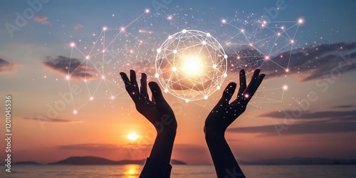 Sunset Silhouette Hands Encircling a Global Network of Connections