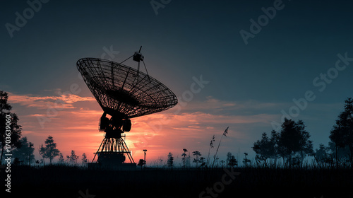 Sunset Silhouette of a Large Satellite Dish in a Field