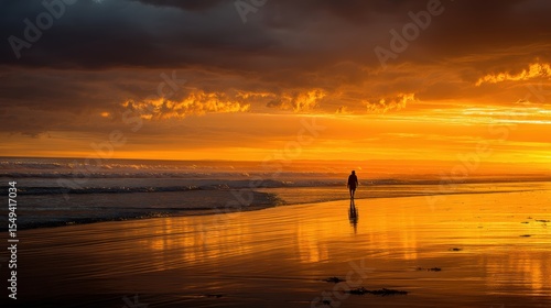 Sunset silhouette of a lone figure walking along the wet sand reflecting golden light