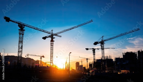 Sunset Silhouette of Construction Cranes at City Development Site