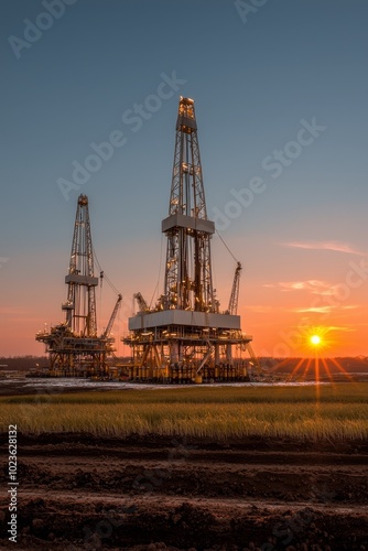 Sunset Silhouettes Majestic Oil Rigs Against Vibrant Sky