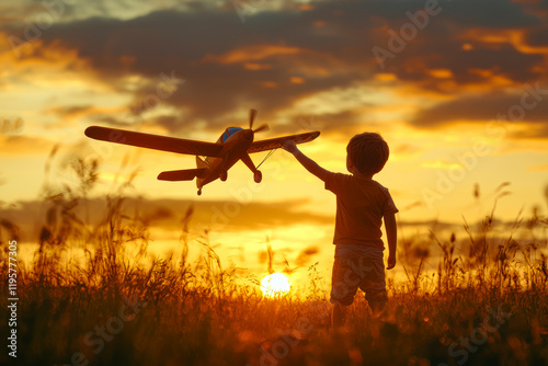 Sunset Soaring A Child's Imaginative Flight towards Freedom and Adventure