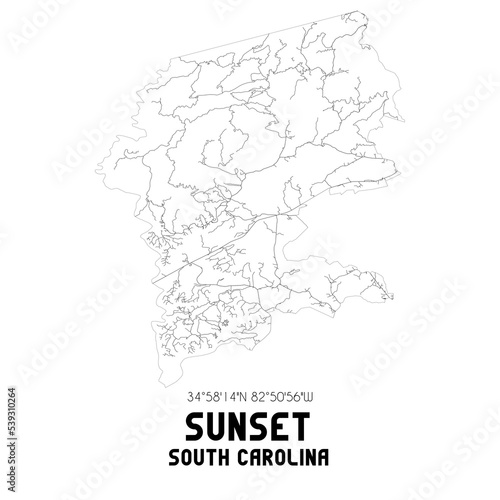 Sunset South Carolina. US street map with black and white lines.