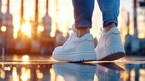 Sunset Stroll White Sneakers Industrial Reflection Urban Exploration