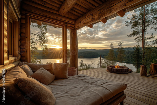 Sunset View from a Cozy Log Cabin Overlooking a Lake and Forest