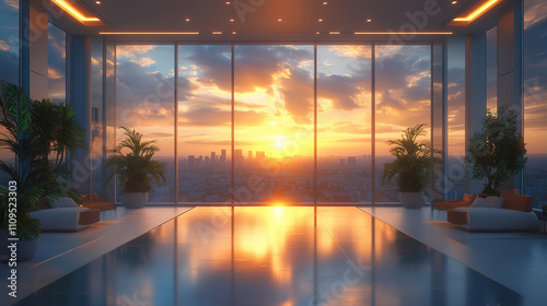 Sunset view from a modern high-rise building with large windows overlooking the city skyline. Generative AI