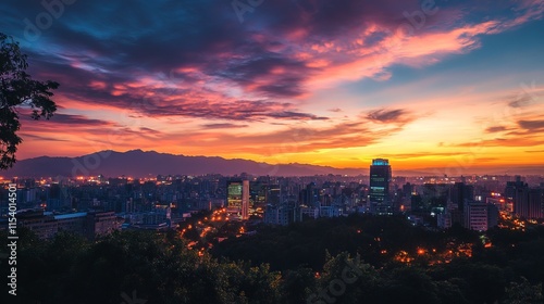 Sunset View of City Skyline with Landmark Building, Mountains, and Colorful Sky in Taiwan's Capital, AI generated illustration