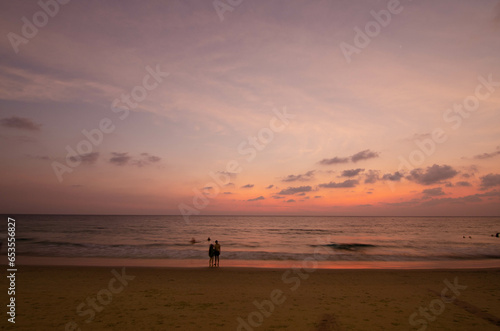 Sunset view of summer beach tropical seashore scenic white sand of Karon beach in phuket thailand with people relaxing doing activity on beach