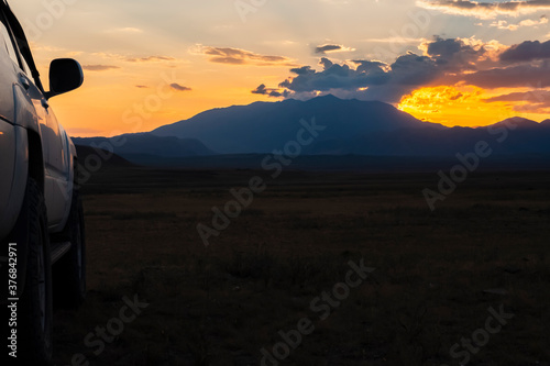 Sunset with suv and mountains silhouette on background. Adventure travel. Tourism concept. Offroad car. Road trip, journey concept.
