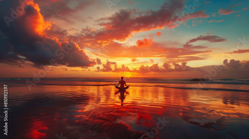 Sunset yoga on a tranquil beach, sky blazes with hues of orange and red.