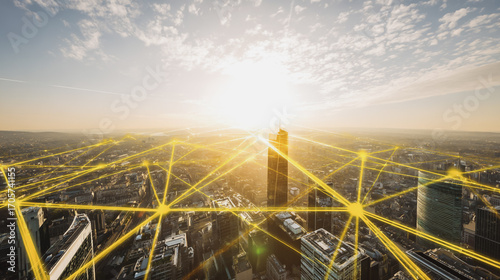Sunshine in the Smart digital Innovation city with connection network reciprocity over the cityscape. of future smart wireless digital city and social media networking systems that connects