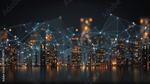 Sunshine in the Smart digital Innovation city with connection network reciprocity over the cityscape. of future smart wireless digital city and social media networking systems that connects