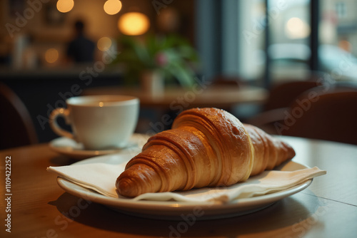 Сup of coffee and croissant on a wooden table in a coffee shop.