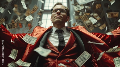 Super business man wears black suits and red robes with super heroes winner concept on a lot of money dollars background and riches. Investors receive a lot of profits. Generative AI.