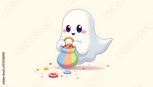 Super Cute Cartoon Ghost Eating Candy from a Colorful Bowl