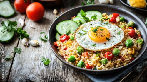 super high-resolution image (minimum 3 megapixels) showcasing a traditional Indonesian dish, Nasi Goreng, elegantly styled on a rustic wooden table