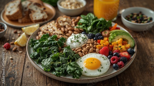 Superfood breakfast or brunch ingredients with fresh fruits, greens, eggs, nuts, and beverages.