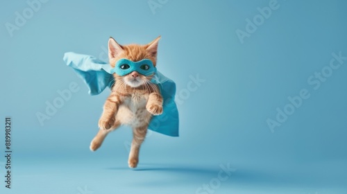 Superhero cat concept, Cute orange tabby kitty with a blue cloak and mask jumping and flying on light blue background with copy space. The concept of a superhero, super cat, leader.