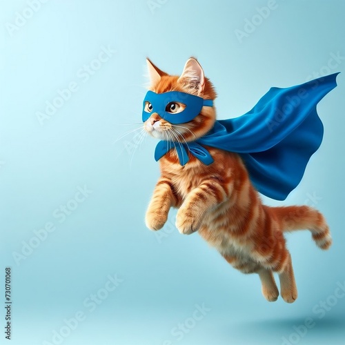 superhero cat, Cute orange tabby kitty with a blue cloak and mask jumping and flying on light blue background with copy space.