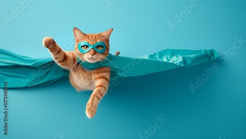 superhero cat, Cute orange tabby kitty with a blue cloak and mask jumping and flying on light blue background with copy space. The concept of a superhero, super cat, leader, funny animal studio shot.