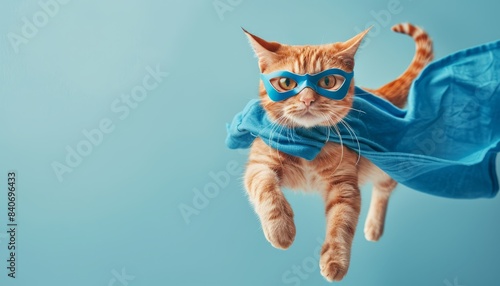 Superhero cat flying with blue mask and cape. Concept of feline heroism by AI generated image